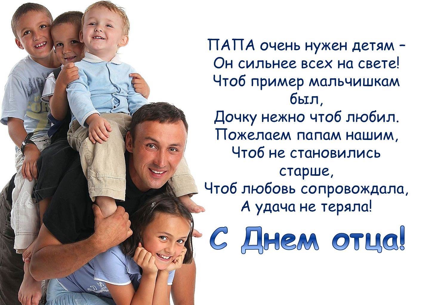 Отец — это не просто слово. В нём столько детских чувств. Для мальчика папа — это пример для подражания, ведь он сильный и смелый, на все руки мастер. Он подскажет всё: как забить гвоздь, как помириться с другом и как постоять за себя. Для девочки папа — это гордость. Каждая маленькая принцесса мечтает встретить своего принца, который будет похож на отца. Мы поздравляем вас с праздником всех отцов и желаю быть достойным родителем для своих детей.